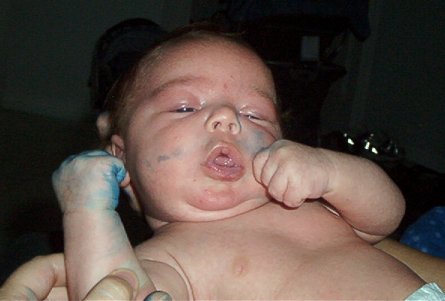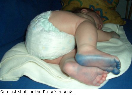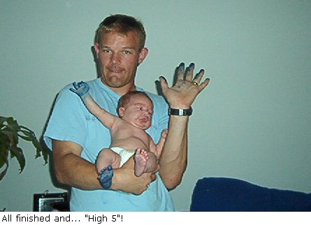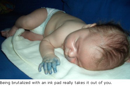 Angie had seen somebodys baby's hand and footprints done for scrapbooking. She decided to get a nice non-toxic washable ink pad and we gave it a go. Turns out "washable" really means "washable in paint stripper" because it took days to come off.